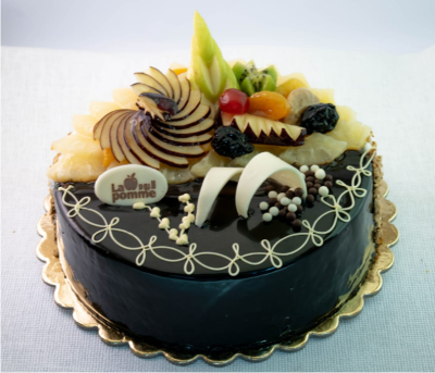 نصف الشيكولاته عباره عن سبونج شيكولاته وكريمه شيكولاته مغطي بالشوكولاته والنصف الاخر سبونج فانيليا وكريمه لباني ومغطي بالفواكه الطازجة