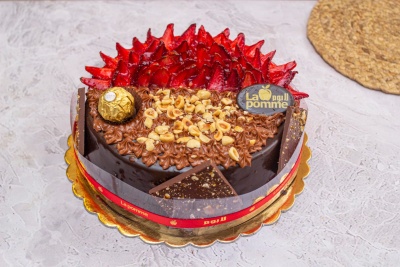 نص فادج تشوكليت محشوة كريمة شيكولاتة فريروروشيه الغنية بمكسرات البندق والمغطاه جلاس شيكولاته وبندق و قطع شيكولاته فريروروشيه ونص سبونج فانيليا محشوه كريمة لباني ومغطاه بقطع الفراوله