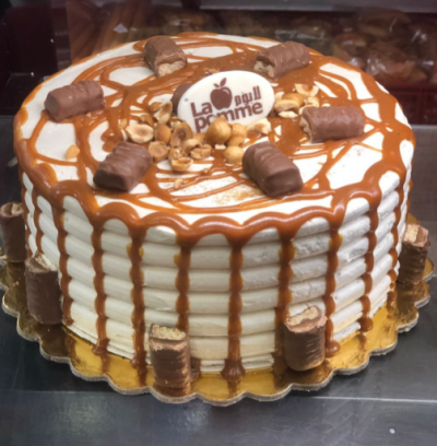 طبقات من الفادج الأبيض واسبونج فانيليا مع راق سابليه محشوة كريمة مربي حليب وكروكاند بندق مغطاة بصوص كراميل مع قطع تويكس
